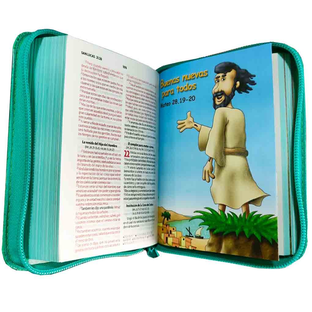 Esta Biblia ha sido diseñada para niños con el fin que lleguen a conocer los relatos bíblicos de una forma amena, contiene 56 láminas a todo color las cuales harán su aprendizaje más divertido y a la vez construimos en ellos las bases de su vida cristiana.