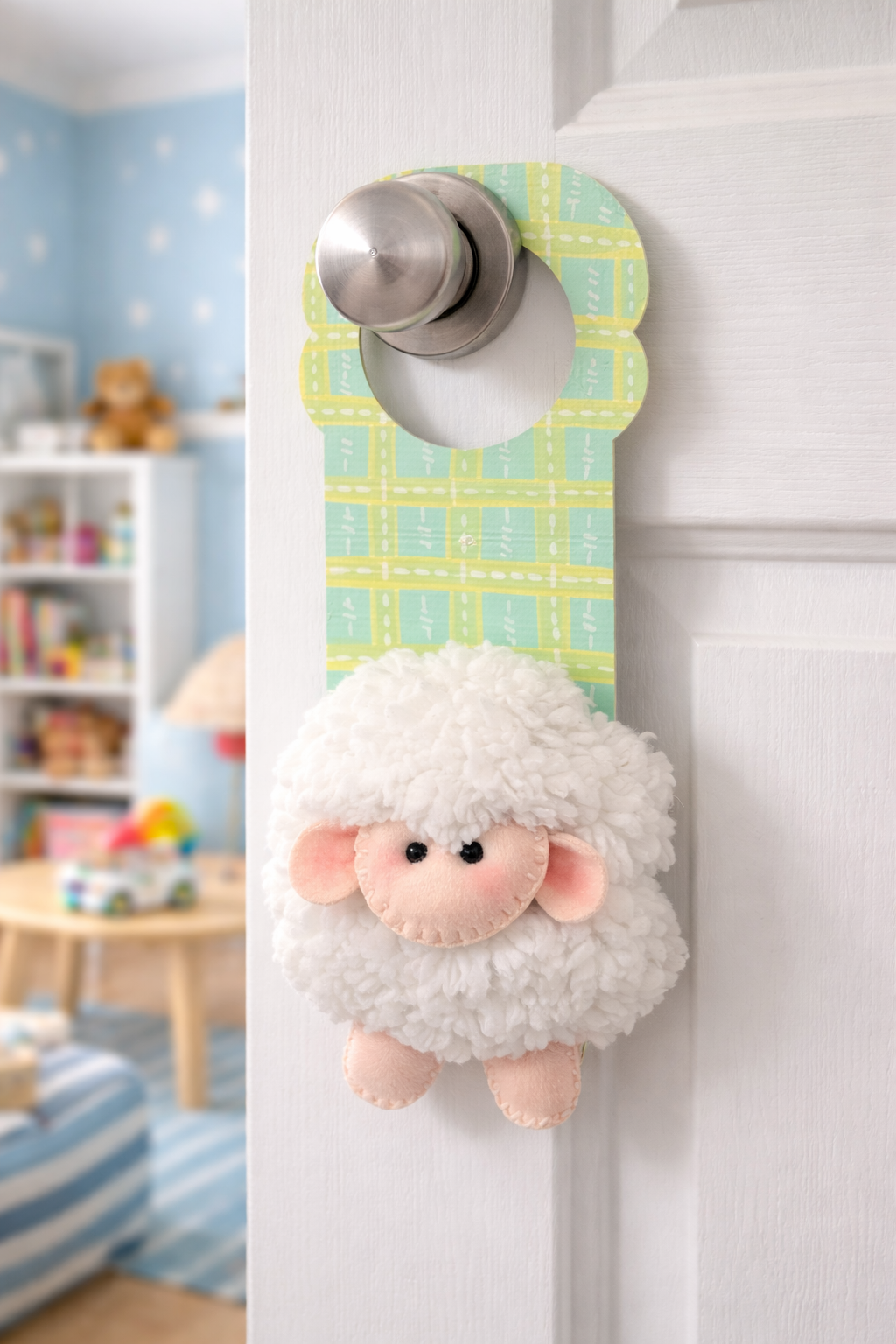 Dale un toque tierno y acogedor a la habitación de tu pequeño con este adorable cuelga puerta en diseño de ovejita. Perfecto para puertas de dormitorio infantil, crea un ambiente cálido y dulce desde el primer momento.